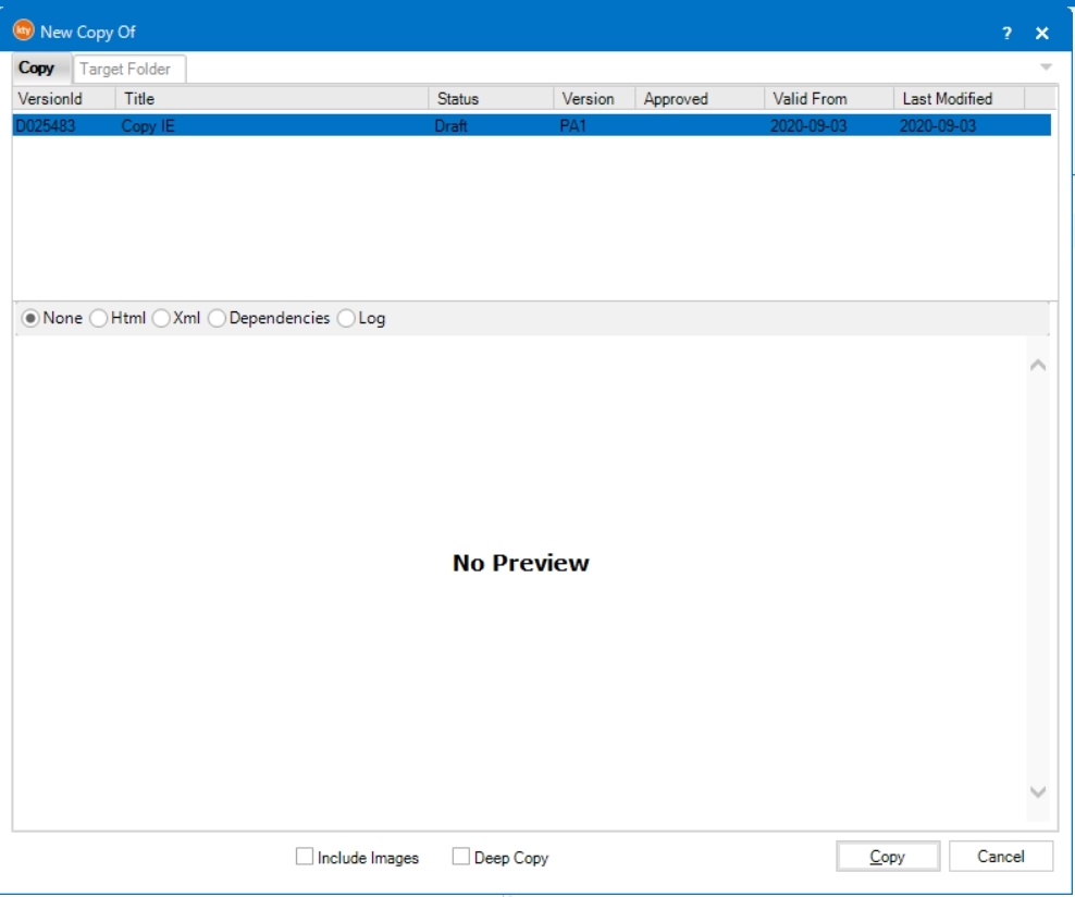 5. Click Copy. Content and meta data are copied from the original IE. Attribute values are not copied. The copy gets the suffix " -COPY" in the title. All the existings ids are replaced with new values (Xml Document only), and the status of the copy is set to Draft.