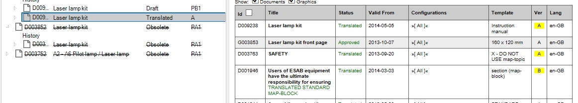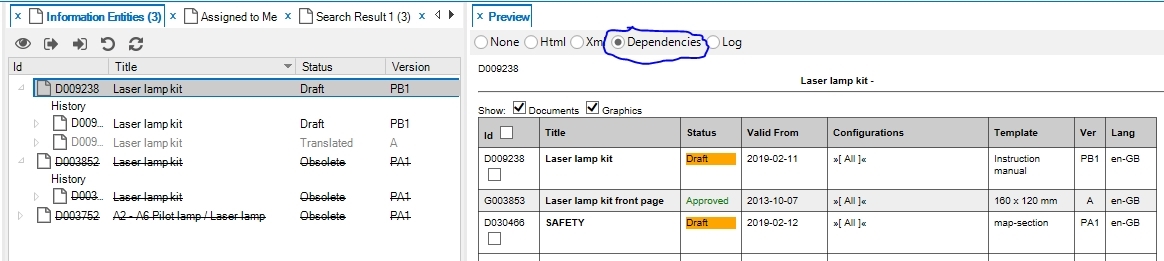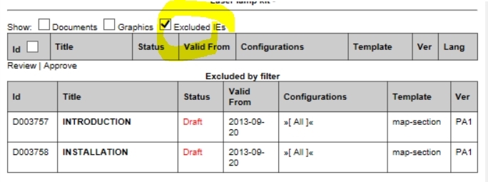 Checking the dependecies is a good thing to do before approval when creating manuals. Process depends always on the work process for the specific implementation. Select the IE on the History row, to show Documents, Graphics and Excluded IEs. Check that there are no later versions of the fragments than the map, no colour markings as shown in the images here.